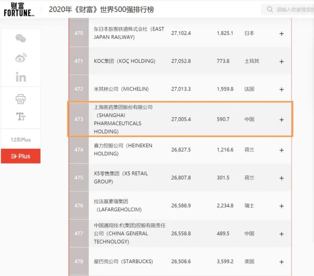 全球500強榜單出爐,上海醫藥強勢登榜